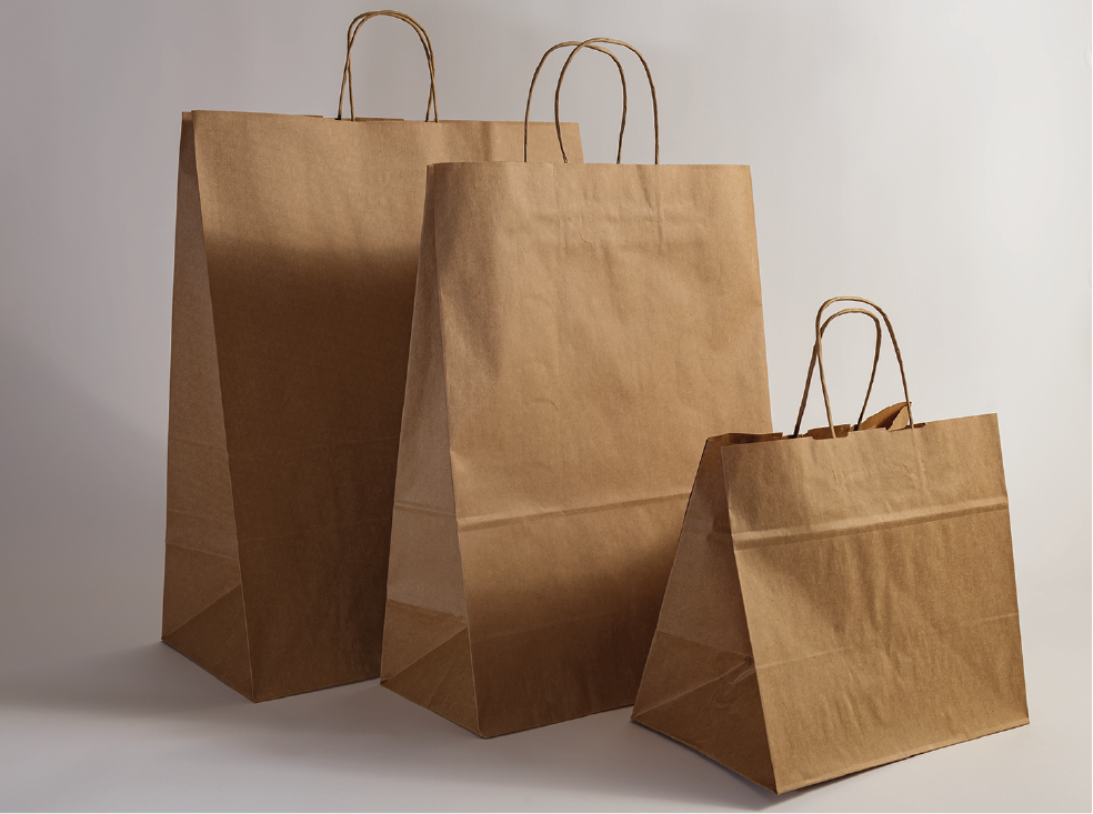 Bolsas con asas de tipo cordel elaboradas en papel Kraft (tipo de papel grueso y de color marrón), resistentes al desgarro, al estallido y la tracción.